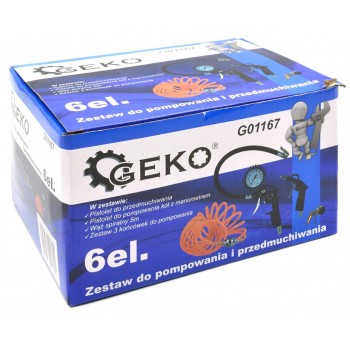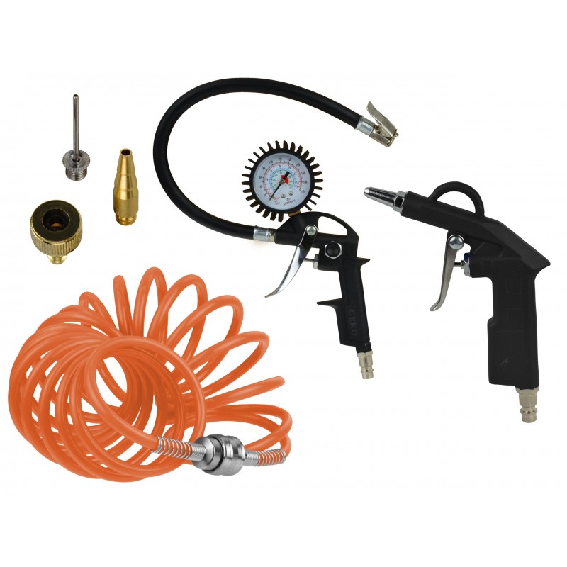 Zestaw pneumatyczny do pompowania i przedmuchiwania z zestawem końcówek do pompowania i wężem pneumatycznym o długości 5m.