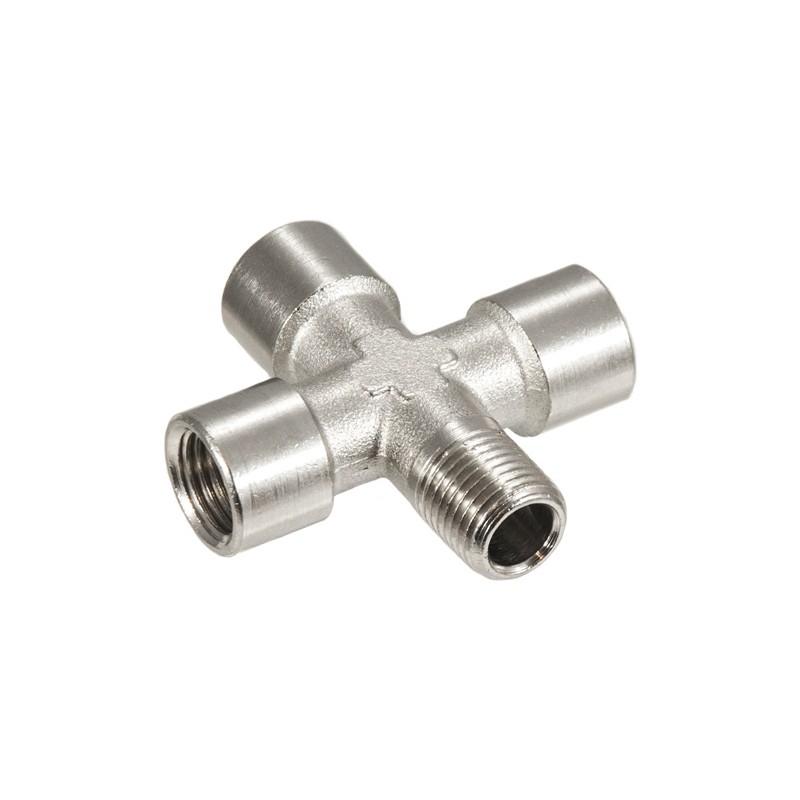 Czwórnik pneumatyczny gwintowany lub inaczej łącznik czwórnikowy to element czterodrogowy wyposażony w cztery gwinty - trzy wewnętrzne i jeden zewnętrzny.