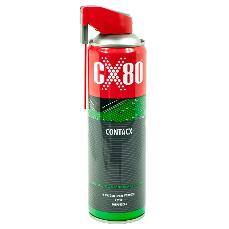 | CX80 CONTACX to specjalistyczny preparat czyszczący przeznaczony do zastosowań w elektronice i elektrotechnice. Skutecznie rozpuszcza oraz usuwa tłuszcze, stare smary i oleje, silikony, siarczki, tlenki, a także pozostałości po lutowaniu, w tym kalafonię. Dzięki temu przywraca czystość oraz prawidłowe działanie styków, złączy i płytek drukowanych, poprawiając przewodność oraz niezawodność połączeń elektrycznych.