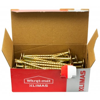 Wkręt konstrukcyjny do drewna ze stali niskowęglowej ocynkowanej galwanicznie w kolorze żółtym.