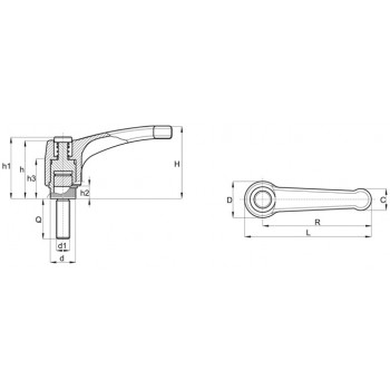 Dźwignia nastawna z trzpieniem używana jest tam gdzie potrzebny jest szybki dostęp do regulacji, poziomowania bądź montażu lub demontażu urządzenia - ręcznie, bez użycia kluczy. Ramię dźwigni wykonane jest z poliamidu wzmocnionego włóknem szklanym. Jest odporne na oleje i smary. Trzpień jest gwintowany i wykonany jest ze stali ocynkowanej. Śruba oporowa jest ze stali oksydowanej z nacięciem na śrubokręt płaski. Sprężyna wykonana ze stali ocynkowanej. Kolor dźwigni czarny matowy RAL 9011. Poniżej więcej zdjęć dźwigni.