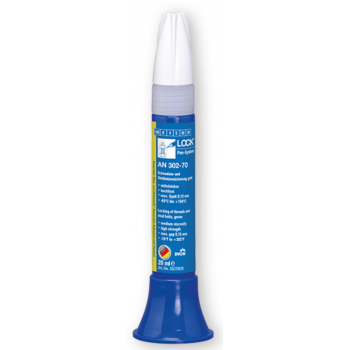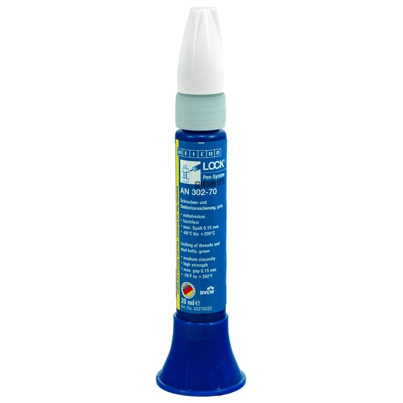 WEICON AN 302-70 to jednokomponentowy, anaerobowy (beztlenowy) środek klejąco-uszczelniający na bazie żywic metakrylowych. Preparat utwardza się po odcięciu dostępu powietrza, kiedy znajduje się między ściśle przylegającymi powierzchniami metalowymi. Został specjalnie stworzony do zabezpieczania, umacniania połączeń śrubowych oraz szpilek z metalu w instalacjach hydraulicznych, pneumatycznych i innych. Skutecznie zapobiega luzowaniu się połączeń, spowodowanym obciążeniami udarowymi i drganiami. Wykazuje się dużą odpornością na chemikalia i rozpuszczalniki. Jest trudno demontowalny.