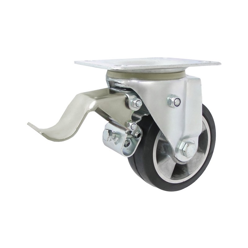 Zestaw kołowy aluminiowo-gumowy składa się z aluminiowego korpusu trwale połączonego z oponą z pełnej gumy oraz obudowy skrętnej z hamulcem. Całość pokryta jest warstwą ocynku, który zabezpiecza przed korozją.