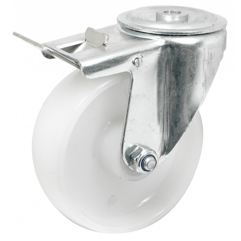 Zestaw kołowy składa się z koła wykonanego z poliamidu PA-6 oraz ze stabilnej stalowej obudowy tłoczonej z centralnym otworem na śrubę mocującą wraz z hamulcem mechanicznym.