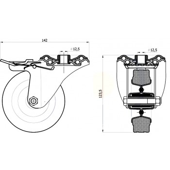 Koło metalowo – gumowe w obudowie z otworem i hamulcem. Wykonane jest ze stalowych elementów tłoczonych. Całość pokryta jest warstwą ocynku, który zabezpiecza przed korozją.