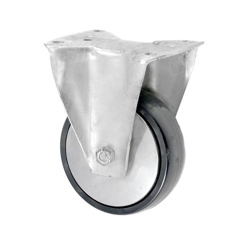 Zestaw kołowy składa się z opony gumowej założonej na stalową obręcz oraz stalowej obudowy stałej z płytką mocującą z 4 otworami.