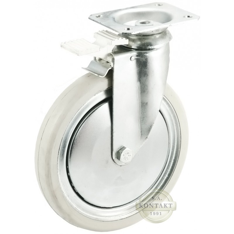Koło metalowo – gumowe o średnicy 200mm w obudowie skrętnej z hamulcem wykonanej ze stali. Obudowa posiada płytkę mocującą z 4 otworami. Całość pokryta jest warstwą ocynku, który zabezpiecza przed korozją. Obudowa dzięki zabezpieczeniu długotrwałym smarem nie wymaga konserwacji. Koło występuje w obudowie montowanej za pomocą tulejki, śruby i nakrętki. Koło z gumy pełnej montowane w tym zestawie nie niszczy oraz nie brudzi podłoża i wyróżnia go cicha praca. Opona standardowa wykonywana jest w kolorze szarym. Dodatkowo w tym modelu zastosowano łożyskowanie podwójnym rzędem kulek ułatwiającym manewrowanie zestawem. Odporność temperaturowa obudowy skrętnej z płytką mocującą mieści się w granicach od -30°C do +130°C. Ponadto jest odporne na uderzenia i doskonale tłumi drgania. Specjalna budowa pozwala na łatwe skręcanie zestawem bez dodatkowych sił i środków pomocniczych oraz zachowanie stabilnego kierunku ruchu w linii prostej.