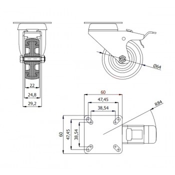 Zestaw kołowy składa się z koła tworzywowo-gumowego oraz ze stabilnej stalowej obudowy tłoczonej z płytką mocującą oraz hamulcem mechanicznym.