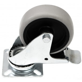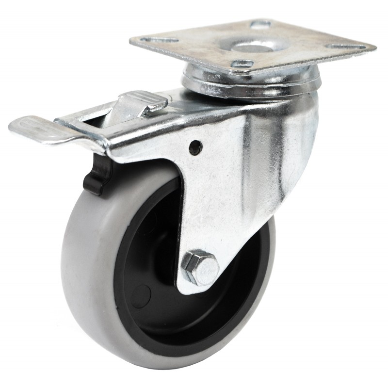 Zestaw kołowy składa się z koła tworzywowo-gumowego oraz ze stabilnej stalowej obudowy tłoczonej z płytką mocującą oraz hamulcem mechanicznym.