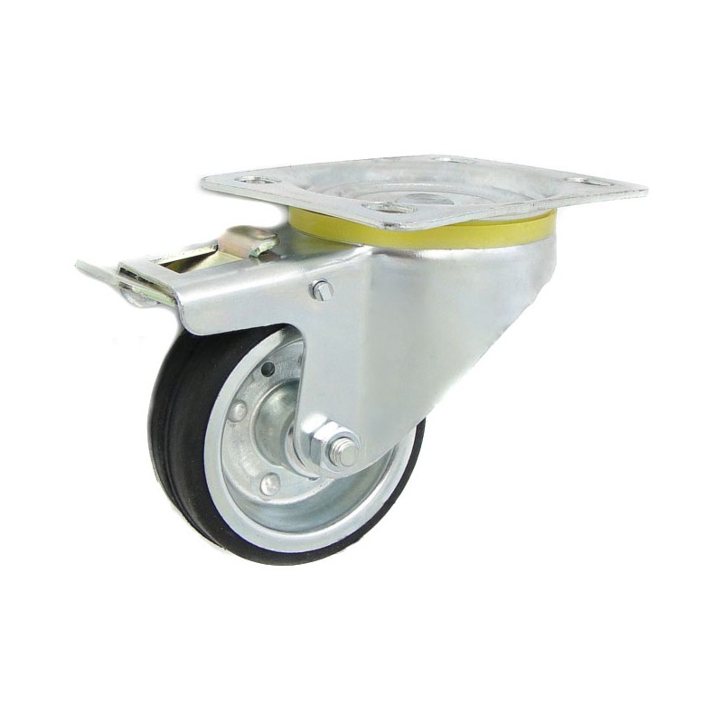 Koło metalowo – gumowe w obudowie skrętnej z hamulcem wykonanej ze stali. Obudowa posiada płytkę mocującą z 4 otworami. Całość pokryta jest warstwą ocynku, który zabezpiecza przed korozją.