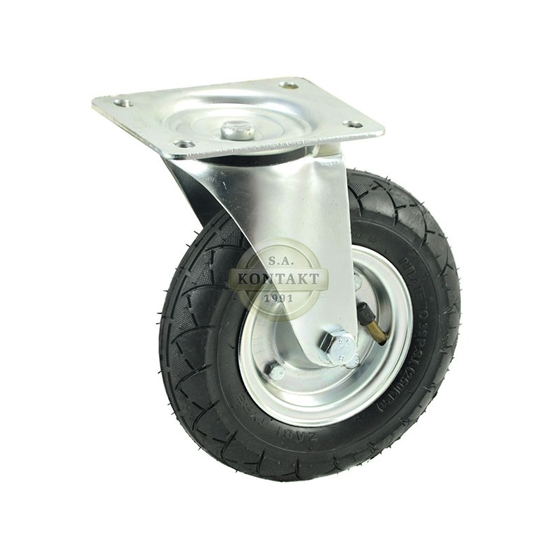 Zestaw kołowy składa się z koła pneumatycznego pompowanego z metalową felgą oraz ze stabilnej stalowej skrętnej obudowy tłoczonej z płytką mocującą.