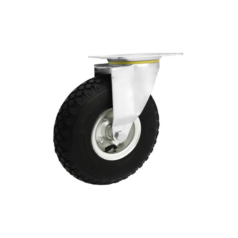Zestaw kołowy składa się z koła pneumatycznego pompowanego z metalową felgą oraz ze stabilnej stalowej skrętnej obudowy tłoczonej z płytką mocującą.