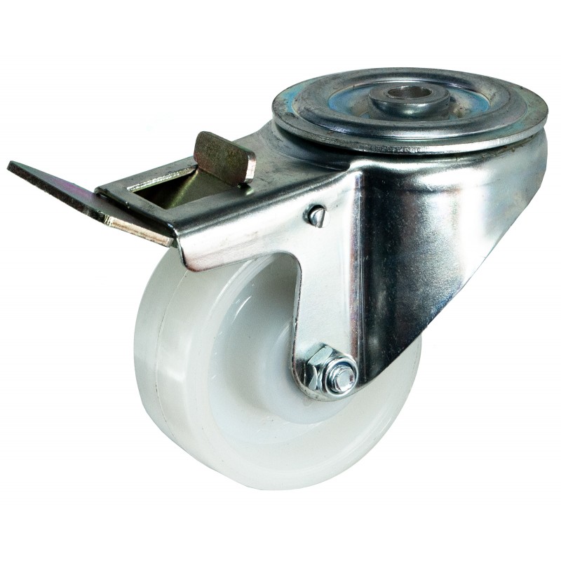 Zestaw kołowy składa się z koła wykonanego z poliamidu PA-6 oraz ze stabilnej stalowej obudowy tłoczonej z centralnym otworem na śrubę mocującą i hamulcem.