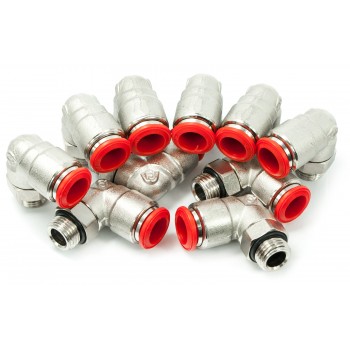 Łącznik wtykowy kątowy inaczej złączka kątowa z gwintem zewnętrznym na wąż to element umożliwiający sprawne połączenie przewodów poliuretanowych, poliamidowych oraz polietylenowych z innymi elementami układu pneumatycznego.
