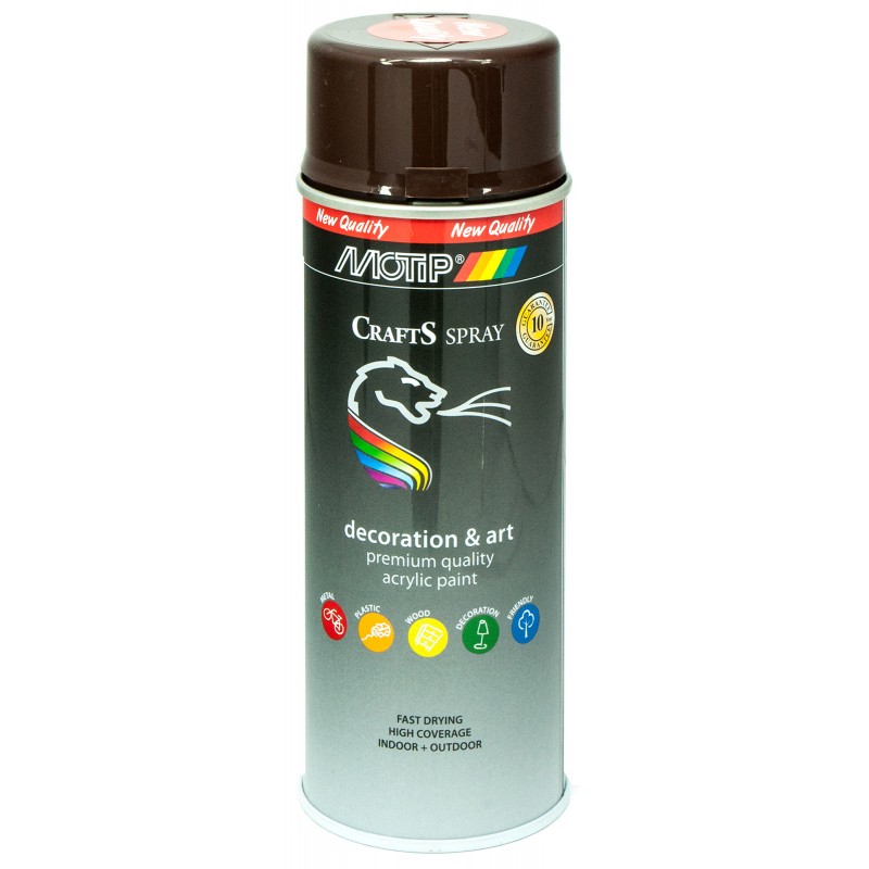 Szybkoschnący lakier akrylowy w aerozolu marki Motip Craft Spray w kolorze "brązowy czekolada" (paleta barw RAL 8017) z połyskliwym wykończeniem.