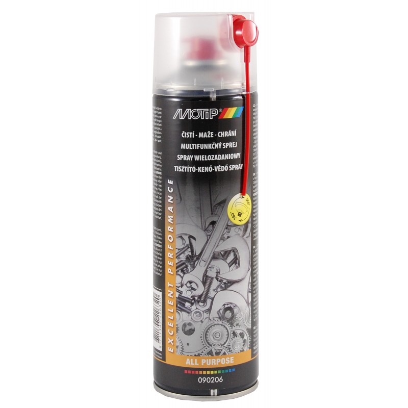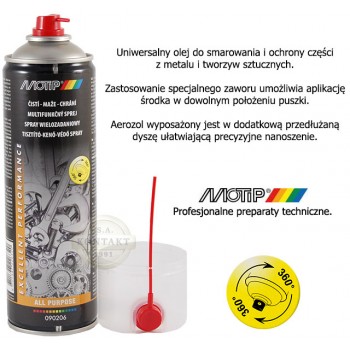 Preparat MOTIP 090206 to olej do smarowania i ochrony części metalowych i tworzyw sztucznych. Posiada właściwości penetrujące i czyszczące. Przenika pod warstwę zanieczyszczeń takich jak: brud, tłuszcz, smar, olej, pozostałości po naklejkach. Rozpuszcza je od wewnątrz ułatwiając ich wyczyszczenie. Po zastosowaniu na powierzchni tworzy się powłoka zabezpieczająca przed korozją oraz powstawaniem nowych zabrudzeń. Preparat jest silnie penetrujący, umożliwia poluzowanie i odkręcenie zapieczonych połączeń. Zastosowanie środka chroni przed nadmiernym tarciem i zużyciem elementów. Powoduje, że mechanizmy lub powierzchnie trące się, sprawniej ze sobą współpracują i nie wydają uciążliwych dźwięków. Środek jest wodoodporny i chroni powierzchnie przed wilgocią. Preparat niezastąpiony w domu, w ogrodzie, w motoryzacji: likwiduje piski i zgrzyty w zawiasach, zamkach, karniszach, żaluzjach, prowadnicach szuflad i drzwi. Pomaga poluzować zapieczone i zardzewiałe śruby, nakrętki słoików, zamki i kłódki. Smaruje i konserwuje metalowe elementy parasoli, wózków dziecięcych, zamki błyskawiczne, kółka w zabawkach i walizkach, zawiasy drzwi do pralki i bram wjazdowych. Zabezpiecza przed korozją podręczne narzędzia w domu i garażu np. śrubokręty, kombinerki, klucze itp. Usuwa zabrudzenia i ślady z gładkich powierzchni (linoleum, parkiet, panele, kafelki, powierzchnie metalowe itd.) Czyści i chroni przed korozją metalowe elementy w samochodzie np. anteny radiowe, felgi, zawiasy itp. Eliminuje piski i zgrzyty elementów metalowych, plastikowych, gumowych i mechanicznych np. pasków klinowych, elementów łożyskowanych. Zabezpiecza urządzenia mechaniczne przed przedwczesnym zużyciem. Czyści, smaruje i zabezpiecza przed korozją ostrza piły, kosiarki i wiele wiecej. Preparat można stosować w dowolnej pozycji puszki. Dodatkowa przedłużana dysza o długości 10 centymetrów umożliwia precyzyjne nanoszenie preparatu. Sposób użycia. Spryskać powierzchnię, pozostawić do wyschnięcia. Optymalne smarowanie uzyskuje się po wyparowaniu rozpuszczalnika. Spray o pojemności 500ml. Numer katalogowy 090206.