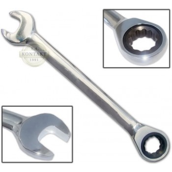 Klucz płasko-oczkowy z grzechotką wykonany jest ze stali chromowo-wanadowej (CrV).