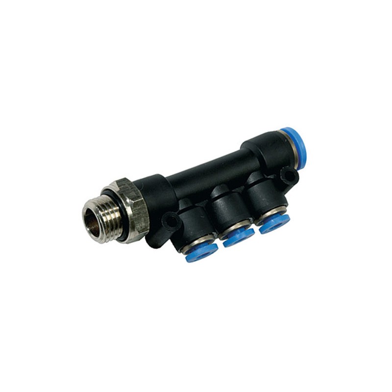 Rozdzielacz wtykowy wielosegmentowy czyli inaczej złączka wtykowa z gwintem zewnętrznym oraz z czterema gniazdami pod wąż to element do połączeń przewodów poliuretanowych, poliamidowych oraz polietylenowych w układach pneumatycznych.