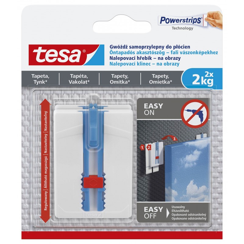 Gwoździe samoprzylepne z regulacją wysokości tesa Powerstrips to sprytna alternatywa dla tradycyjnych gwoździ, która powstała z myślą o wieszaniu przedmiotów na powierzchniach fakturowanych i delikatnych. Gwoździe samoprzylepne z tego zestawu nadają się do bezpiecznego mocowania płócien, obrazów i ram o grubości do 40mm.