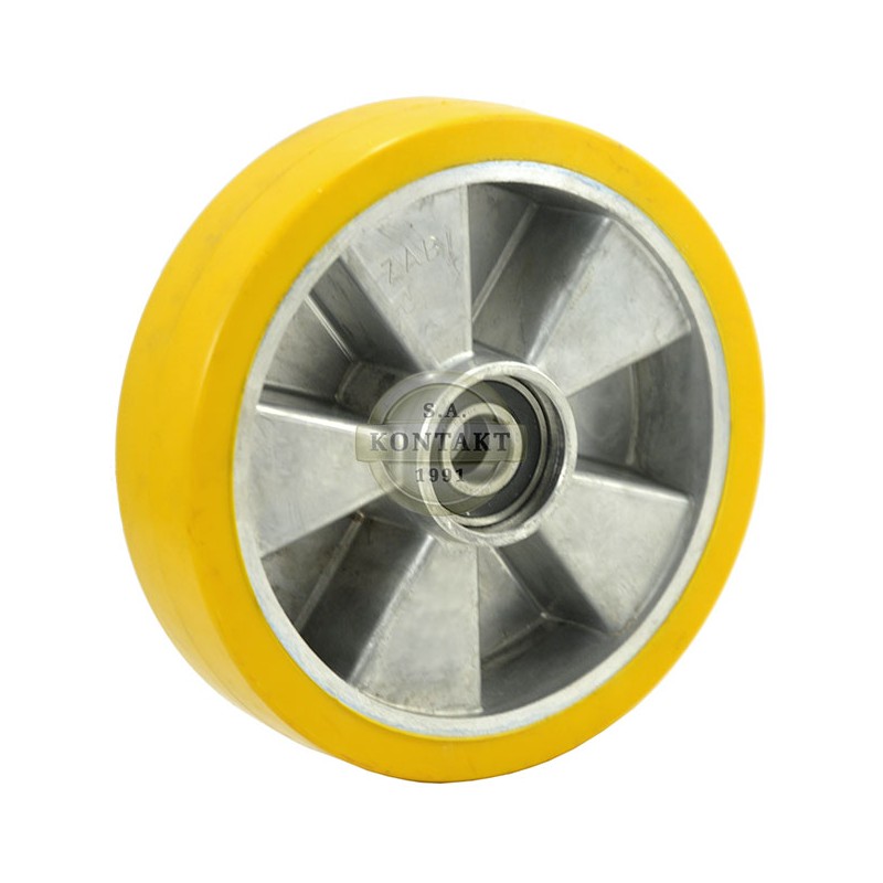 Zestaw kołowy składają się z obręczy wykonanej z aluminiowego korpusu, trwale połączonym bieżnikiem poliuretanowym.