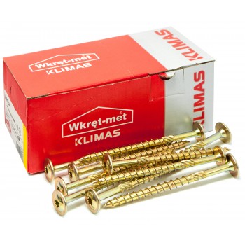 Wkręt konstrukcyjny do drewna ze stali niskowęglowej ocynkowanej galwanicznie w kolorze żółtym.