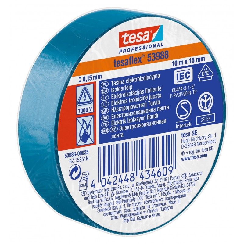 Taśma elektroizolacyjna TESA tesaflex 53988 zgodna z normami  IEC 60454-3-1 (VDE, IMQ, SEMKO), VOC, RoHS 2.0 oraz REACH to niezawodny produkt przeznaczony dla elektryków, mechaników oraz innych użytkowników.  Taśma wykonana jest z tworzywa PVC z dodatkiem plastyfikatorów pokrytego naturalnym klejem kauczukowym spowalniającym płomień. Taśmę cechuje wysoki stopień elastyczności i bardzo dobra efektywność klejenia, nawet na powierzchni stalowej i w niskich oraz wysokiej temperaturze do 90°C.