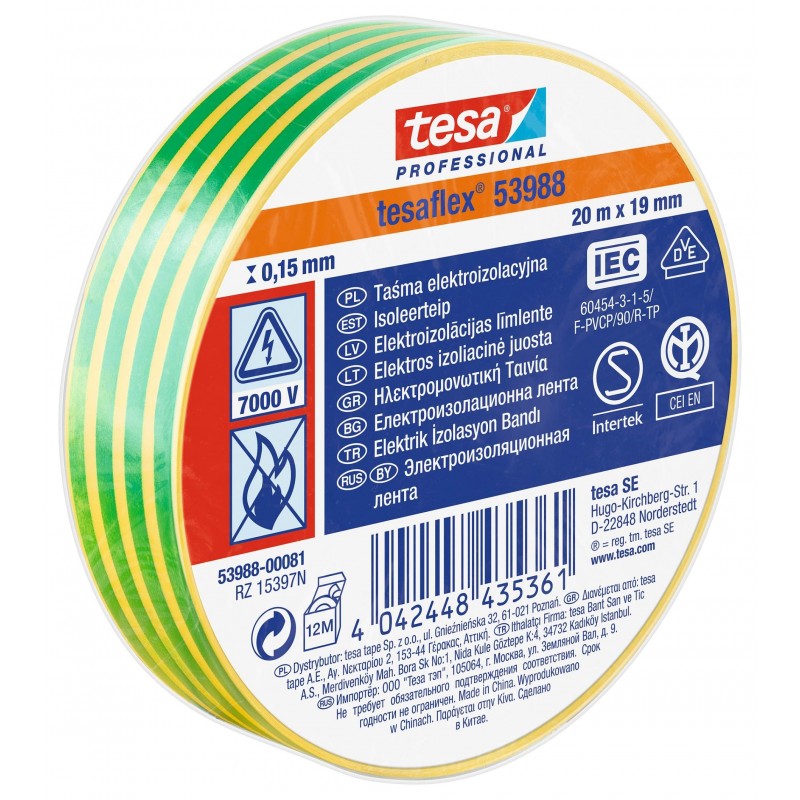 Taśma elektroizolacyjna TESA tesaflex 53988 zgodna z normami  IEC 60454-3-1 (VDE, IMQ, SEMKO), VOC, RoHS 2.0 oraz REACH to niezawodny produkt przeznaczony dla elektryków, mechaników oraz innych użytkowników.  Taśma wykonana jest z tworzywa PVC z dodatkiem plastyfikatorów pokrytego naturalnym klejem kauczukowym spowalniającym płomień. Taśmę cechuje wysoki stopień elastyczności i bardzo dobra efektywność klejenia, nawet na powierzchni stalowej i w niskich oraz wysokiej temperaturze do 90°C.