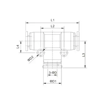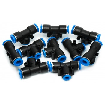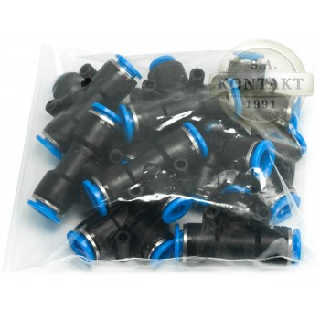 Trójnik redukcyjny typ T czyli inaczej złączka wtykowa redukcyjna T pod wąż to element do połączeń przewodów poliuretanowych, poliamidowych oraz polietylenowych o różnej średnicy w układach pneumatycznych.
