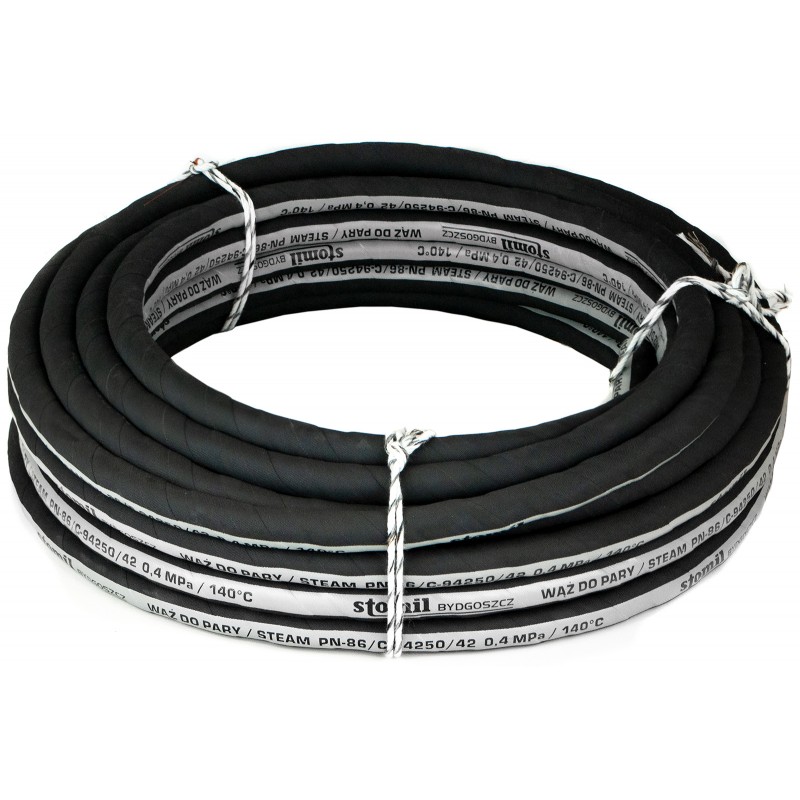 Wąż gumowy STOMIL o średnicy wewnętrznej 12,5mm służy do przesyłania pary wodnej nasyconej pod ciśnieniem 0,4 MPa w urządzeniach przemysłowych.