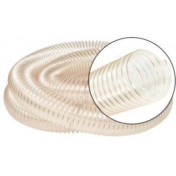 Wąż spiralny odciągowy antystatyczny 2PU-PUR przeznaczony jest do odprowadzania gazów, oparów różnych substancji chemicznych, olejów, benzyn, pyłów, dymów, trocin, materiałów sypkich czy też elementów o dużym współczynniku ścierania w strefach zagrożenia wybuchem. Wąż wentylacyjny charakteryzuje się dużą elastycznością oraz lekkością, pracuje najczęściej jako wąż ssawny (w warunkach podciśnienia), ale może być również wykorzystywany jako tłoczny (przy nadciśnieniu) do nadmuchu np. powietrza. Ma wysoką wytrzymałość na rozciąganie i rozrywanie. Stosowany jest w rolnictwie i przemyśle w różnych gałęziach: drzewnej, budowlanej, metalowej, spożywczej. Wąż wentylacyjny spiralny odciągowy 2PU-PUR to antystatyczny, lekki wąż wykonany z poliuretanu estrowego premium (Pre-PUR), ze wzmocnieniem z drutu ze stali sprężynowej umieszczonej w jego ściance. Ścianka węża jest trwale antystatyczna - zgodna z ISO 8031 rezystancja powierzchniowa <10⁹ Ω. Wąż jest odporny na promienie UV i ozon oraz jest szczelny dla gazów i cieczy. Jest zgodny z normą ATEX 2014/34/EU (1999/92/EC) i niemiecką normą TRGS 727: odpylanie palnych pyłów (strefa 22 wewnątrz), przesył niepalnych cieczy, do zastosowania w strefie 1 i 2 (gazy). Spełnia wymogi bezpieczeństwa branżowego towarzystwa ubezpieczeniowego przemysłu drzewnego Holz-BG. Jest trudno zapalny wg UL94-HB. Dostosowany do przepisów dyrektywy RoHS. Lista zastosowań węża 2PU-PUR: urządzenia odciągowe, urządzenia odpylające, urządzenia filtrujące, odciągi mgły olejowej: stacjonarne, mobilne. Przemysł chemiczny: odciągi oparów chemicznych, węże wahadła gazowego przy ramionach za i wyładunkowych, wyciągi oparów farbiarskich, wyciąg mgły z rozpylonych farb. Odciągi lub przesył w strefach zagrożenia wybuchem, węże odprowadzające ładunki elektrostatyczne, węże antystatyczne, węże elektrycznie przewodzące. Obory i stajnie: wentylacja. Wyciąg pyłów drzewnych (DIN4102-B1): pył drzewny, wióry drzewne, przemysł drzewny, produkcja mebli, tartaki. Odciągi pyłu drzewnego (DIN4102-B1): piły do płyt, piły, maszyny do obróbki drewna, maszyny do obróbki obrzeży, szlifierki parkietowe. Odciągi pyłu drzewnego (DIN4102-B1): maszyny CNC, centra obróbcze CNC (zwłaszcza dla centrów szybkoobrotowych). Autobusy, pojazdy użytkowe, przyczepy kempingowe, samochody kempingowe, łodzie, statki, jachty: wentylacja, ogrzewanie. Przemysł pomieszczeń czystych: wentylacja pomieszczeń czystych, maszyny do produkcji..